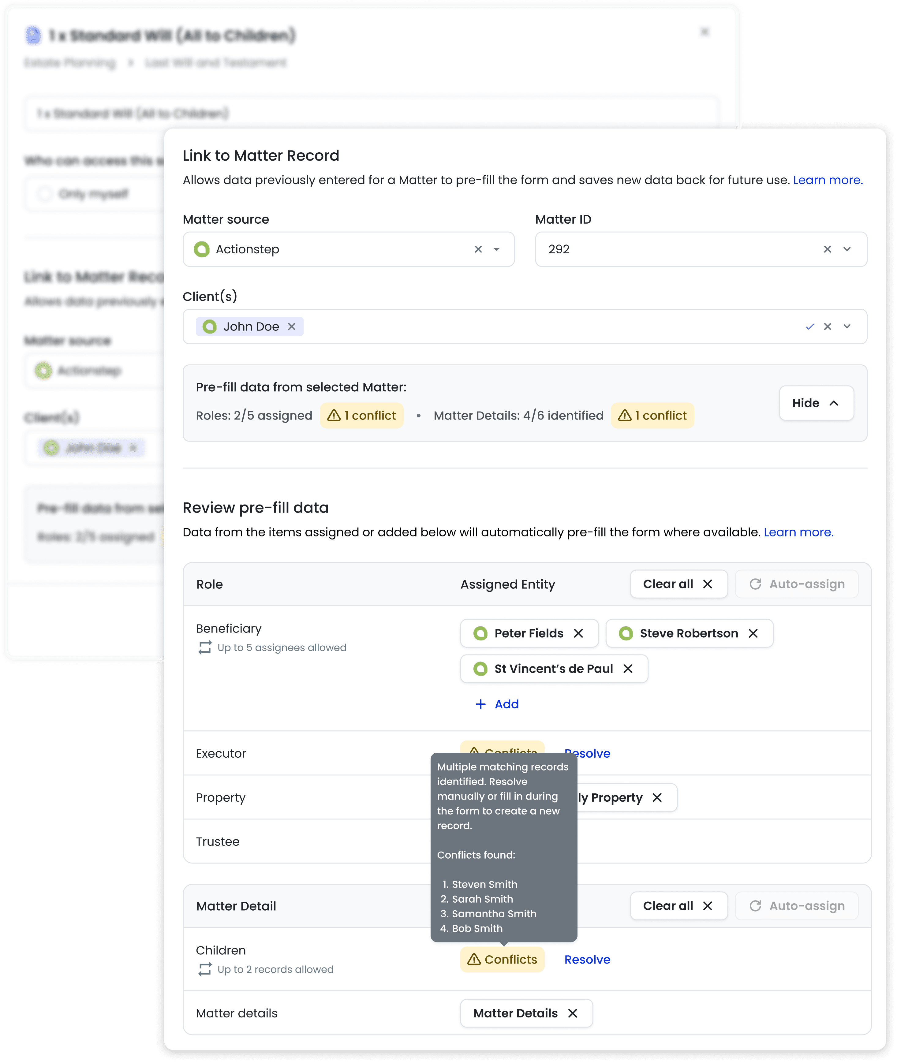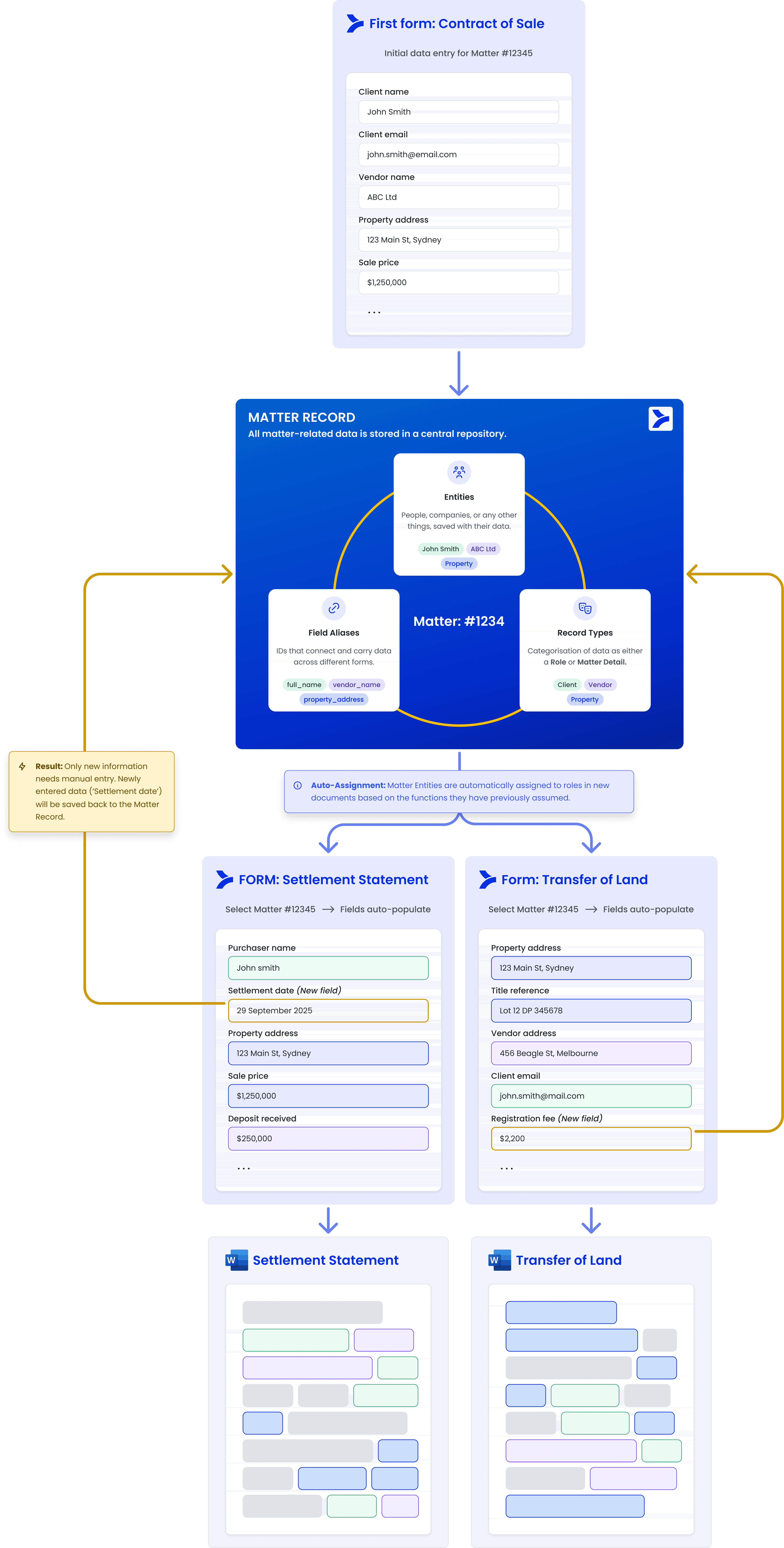 Next time filling a form: Stored entities auto-assign to Roles and Matter Details - any existing data pre-fills the form and document.