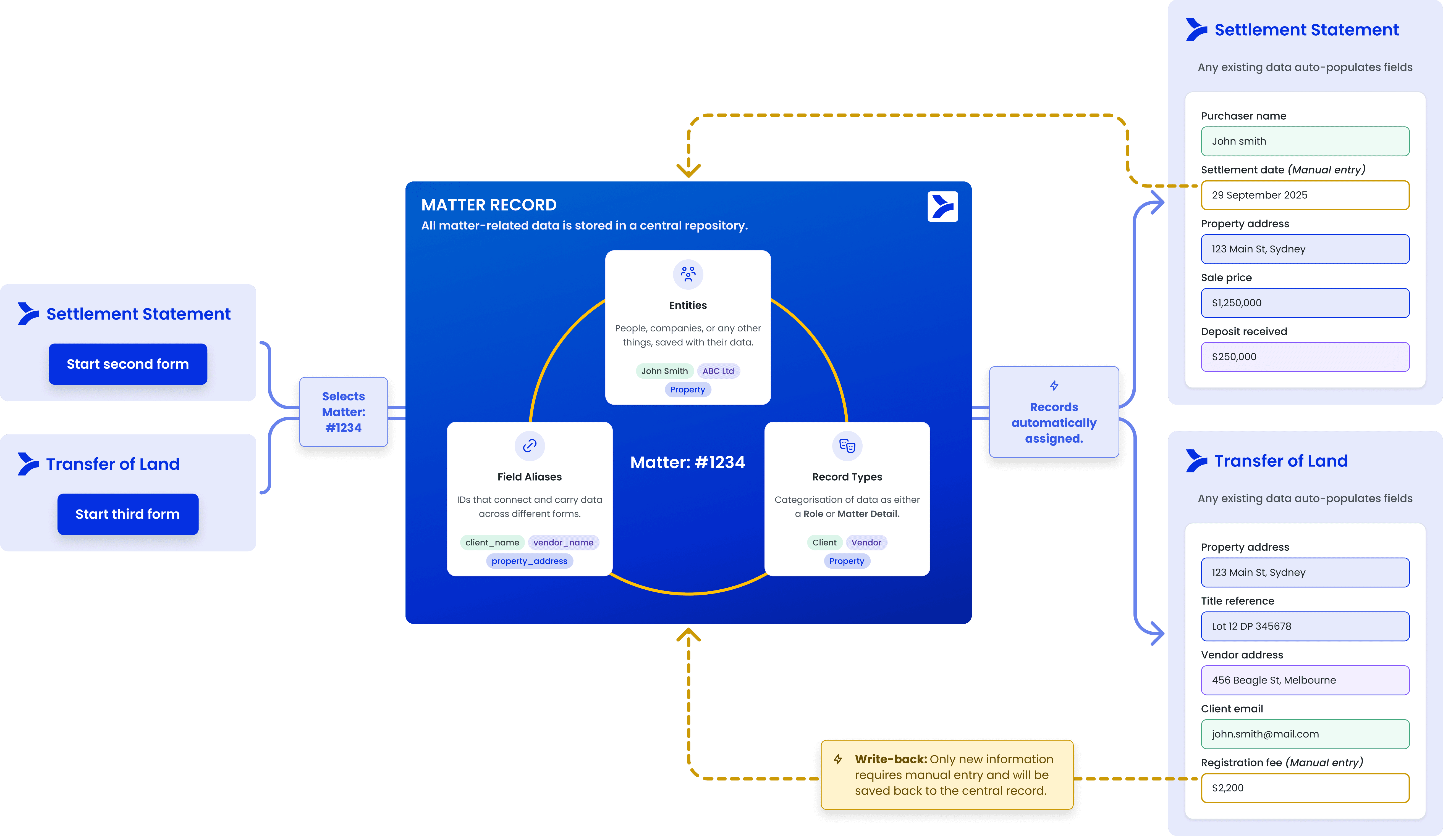 Next time filling in a form: Entities will automatically be assigned based on data stored in the Matter Record from previous submissions, and any existing data will pre-fill the form and thus the document.