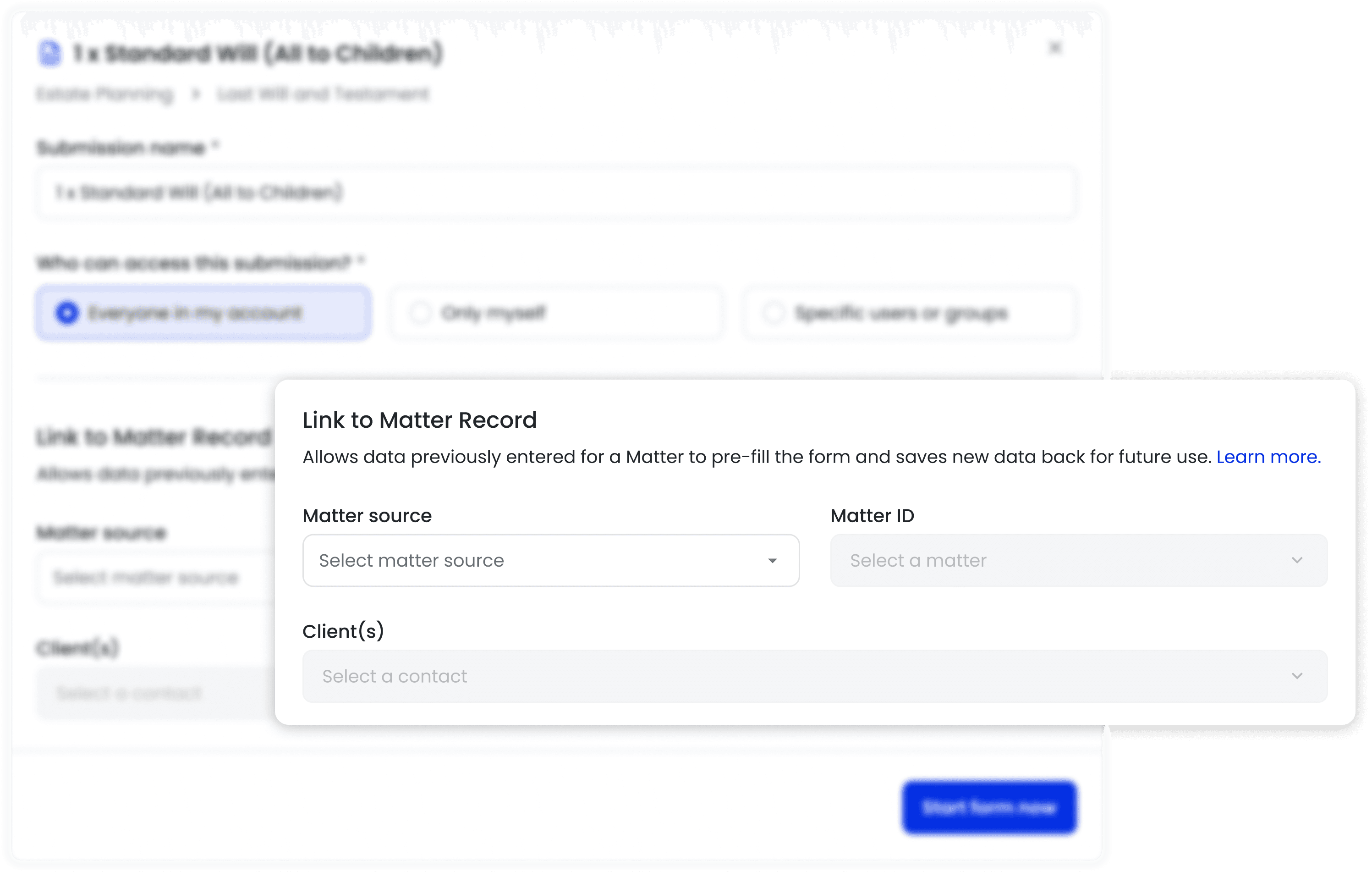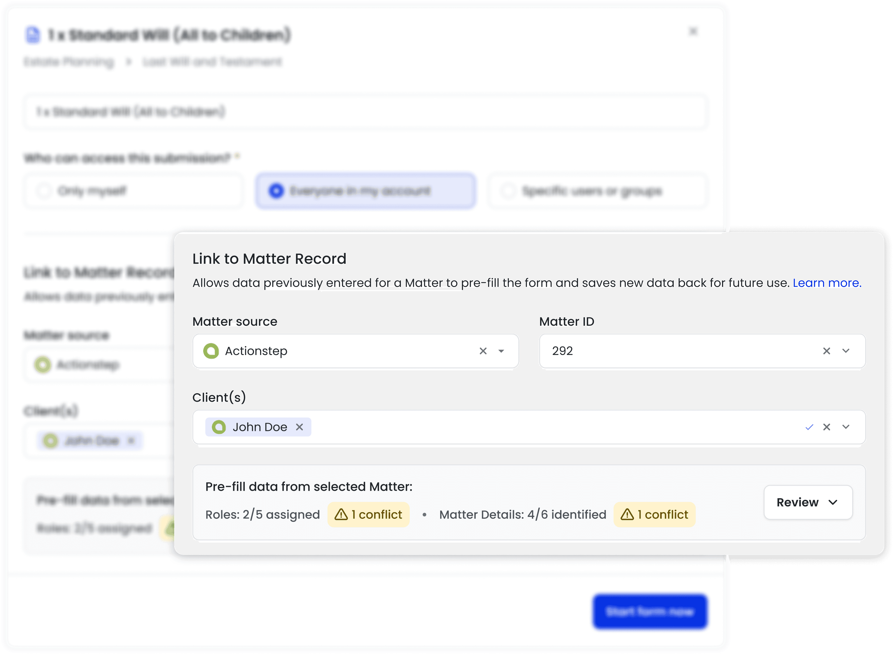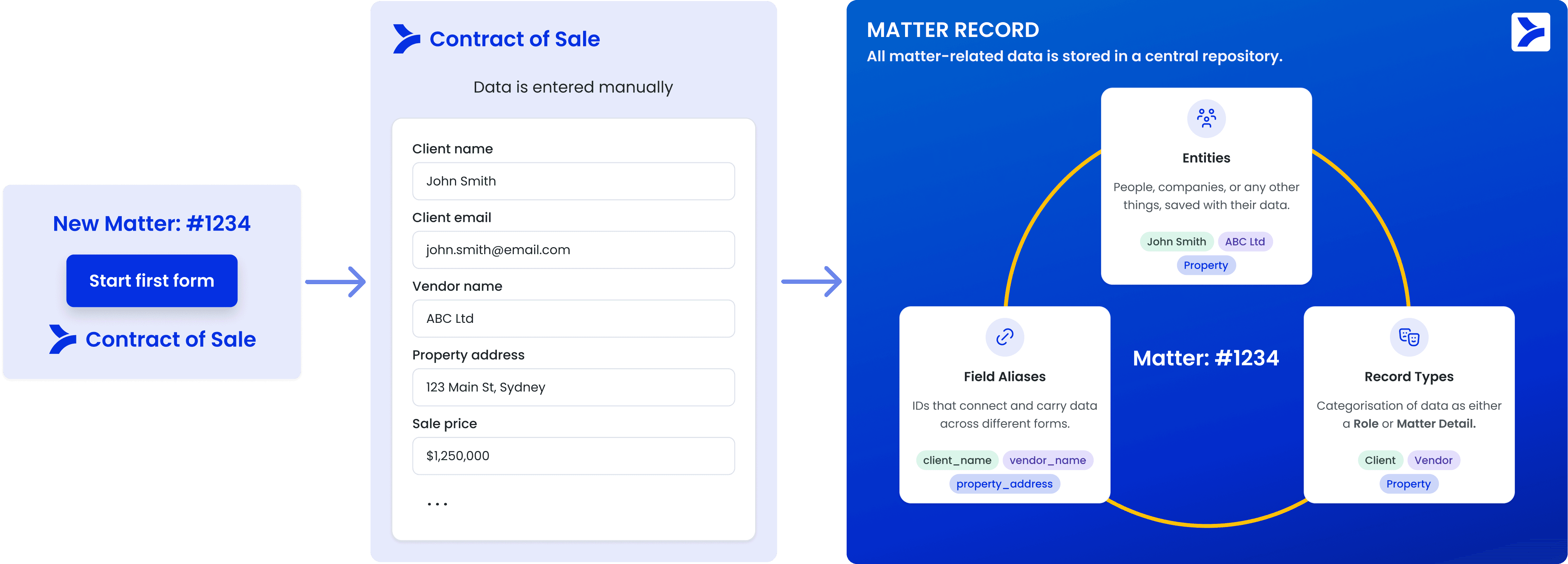 First time filling a form: If no data exists yet, the form-filler enters it manually and it’s saved to the Matter Record.