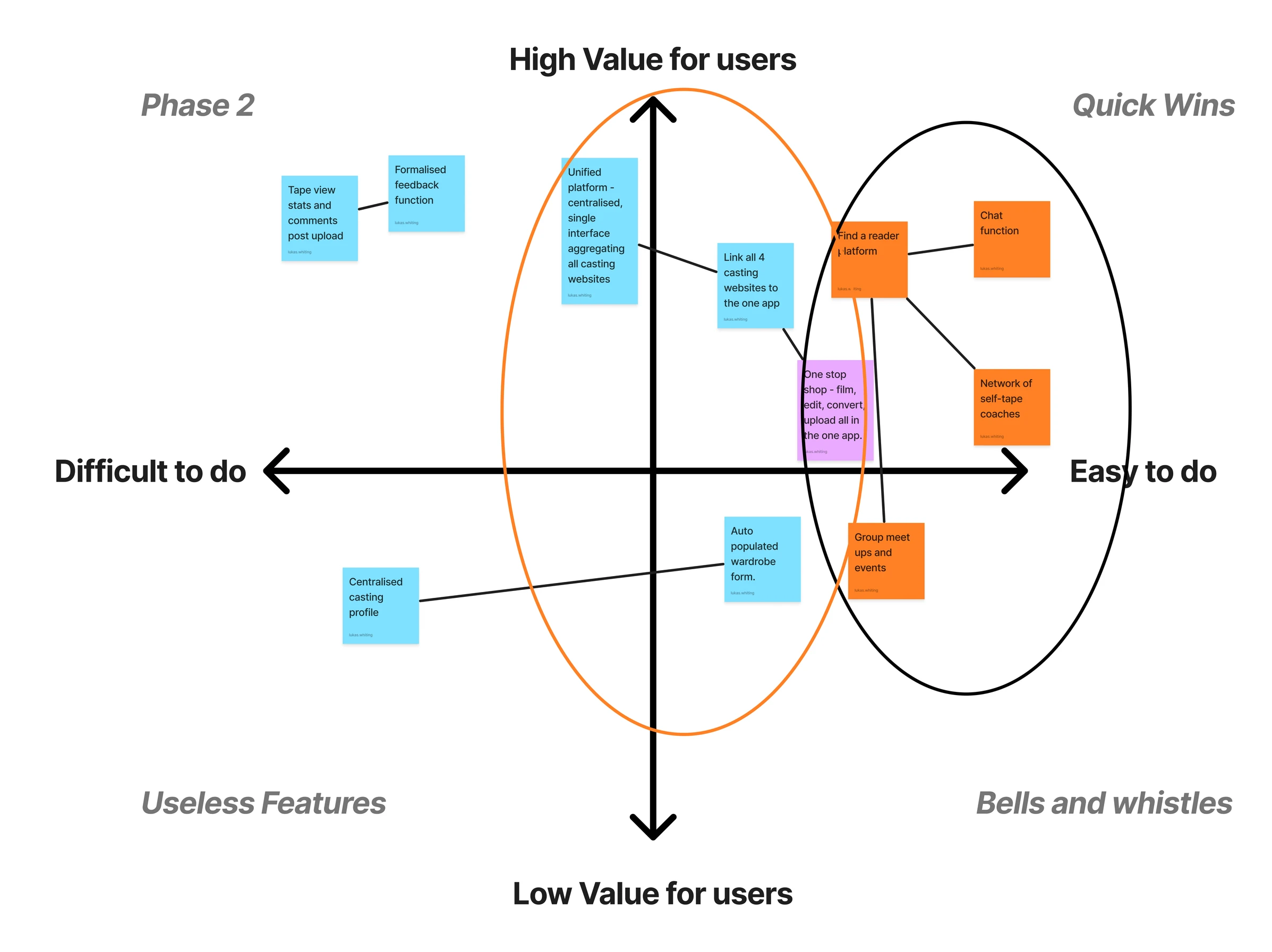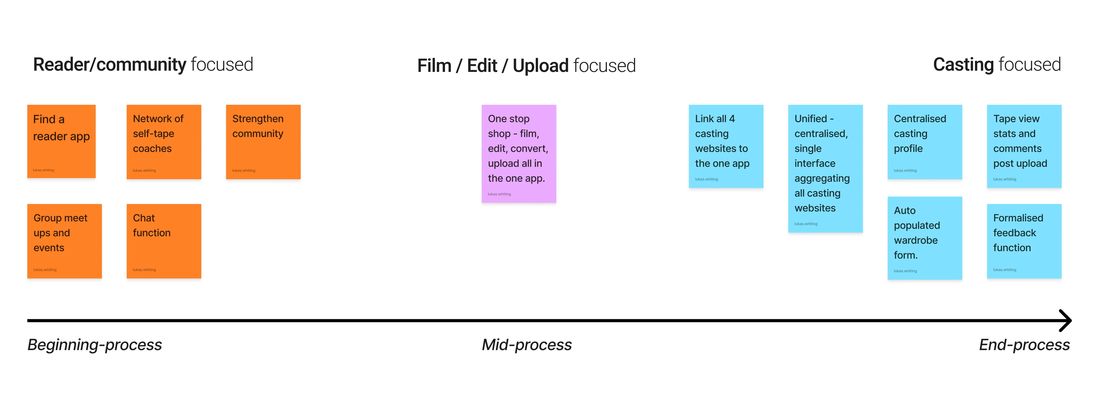 Situating the ideas on an MVP matrix and a process timeline helped me identify what stage of the self-tape journey each idea catered to. The later in the process an idea sat, the more it would be influenced by those systemic issues and the less solvable it became. These ideas went on to become phase 2 considerations or altogether useless features.