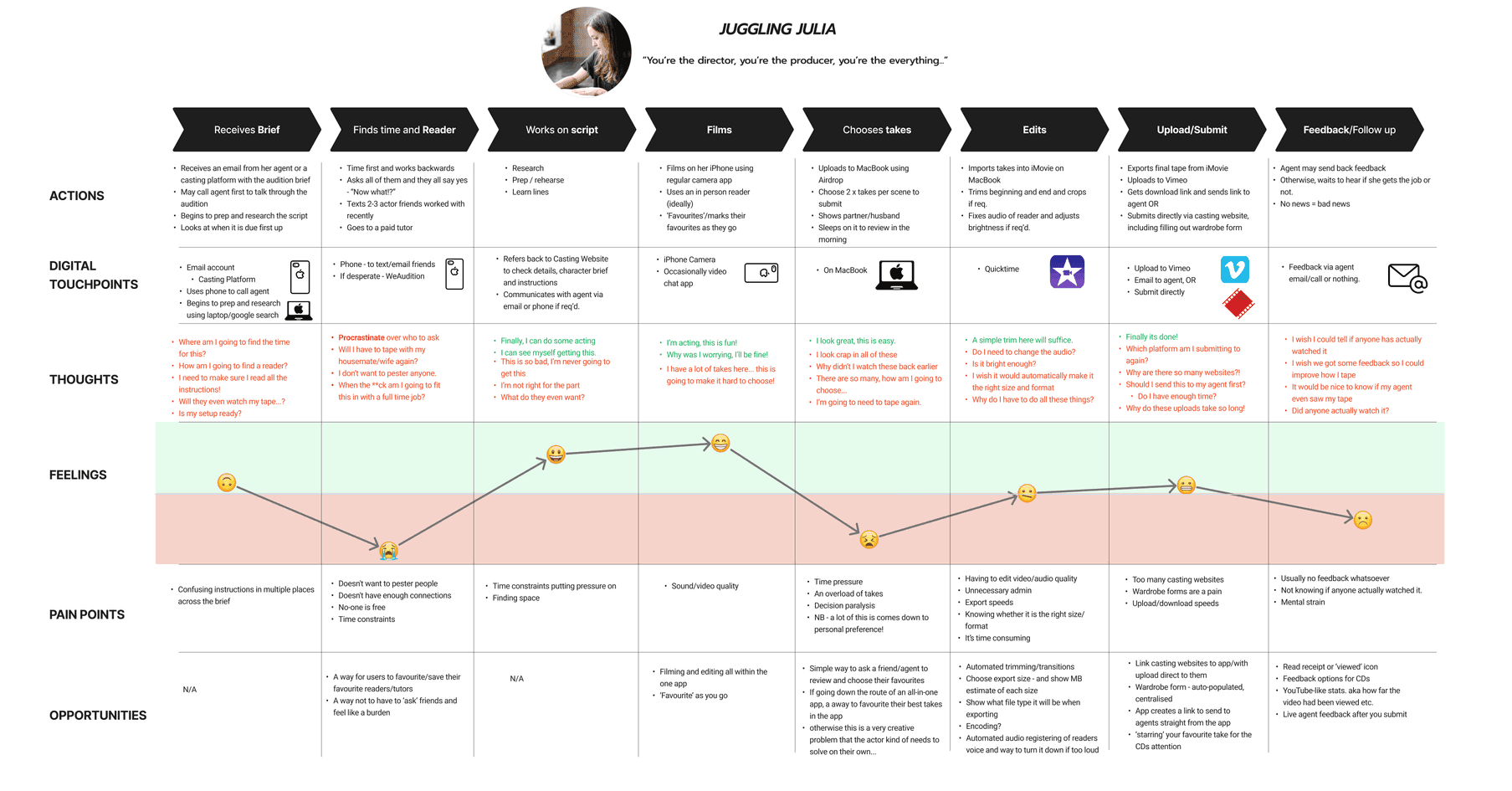As an actor myself I wanted to empower actors to take back control via a digital solution. I understood personal biases would be unavoidable, however laying them out early in my scoping allowed me to work around them when they reared their ugly head.